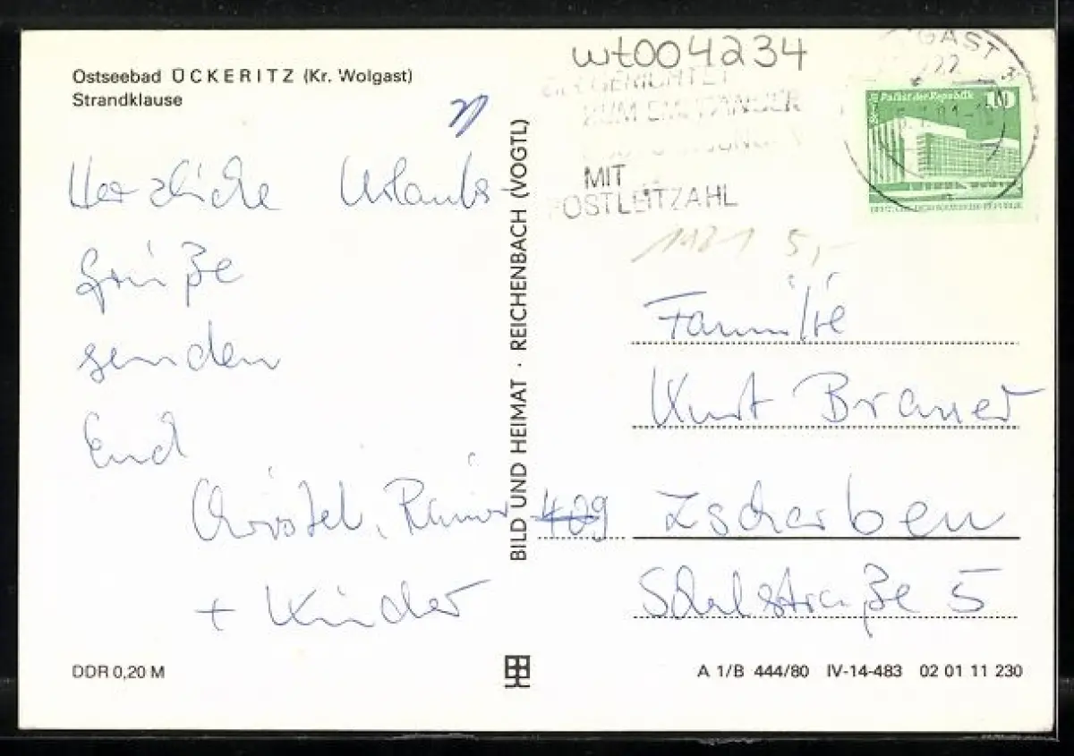 Personenbezogene Daten auf der Rückseite der Karte wurden durch blauen Textmarker unkenntlich gemacht. Die blauen Stellen sind auf die Vorderseite durchgeweicht und wirken sich negativ auf das Postkartenfoto aus