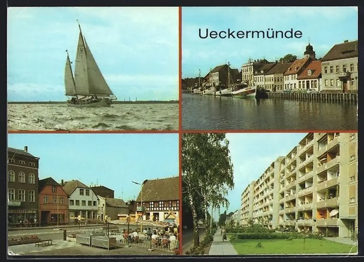 AK Ueckermünde, Pionierschiff Immer Bereit, Blick zum Hafen, Karl-Marx-Platz