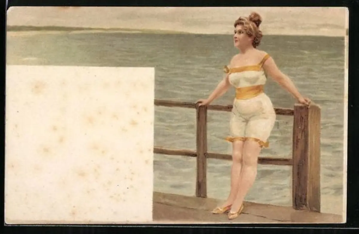 AK Üppige Frau posiert in Bademode auf einem Seesteg