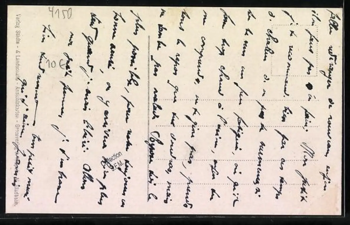 Personenbezogene Daten auf der Rückseite der Karte wurden durch blauen Textmarker unkenntlich gemacht. Die blauen Stellen sind auf die Vorderseite durchgeweicht und wirken sich negativ auf das Postkartenfoto aus