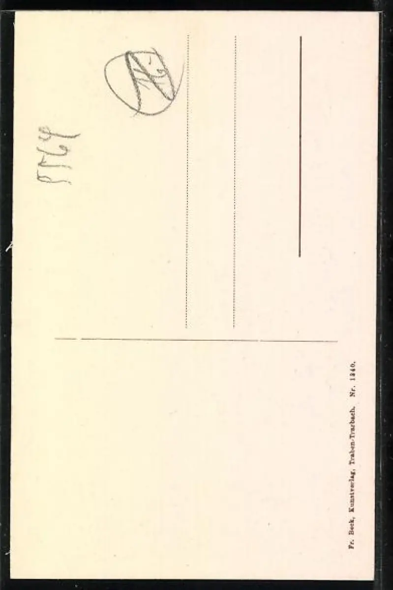 Personenbezogene Daten auf der Rückseite der Karte wurden durch blauen Textmarker unkenntlich gemacht. Die blauen Stellen sind auf die Vorderseite durchgeweicht und wirken sich negativ auf das Postkartenfoto aus