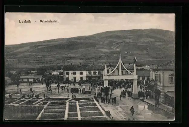 AK Uesküb, Bahnhofsplatz mit Torbogen und Menschenmenge aus der Vogelschau