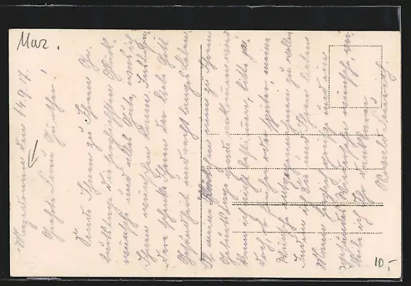 Personenbezogene Daten auf der Rückseite der Karte wurden durch blauen Textmarker unkenntlich gemacht. Die blauen Stellen sind auf die Vorderseite durchgeweicht und wirken sich negativ auf das Postkartenfoto aus