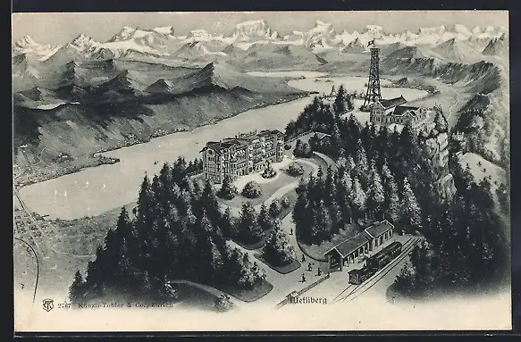 AK Uetliberg, Panorama mit Bergbahn an einer Station