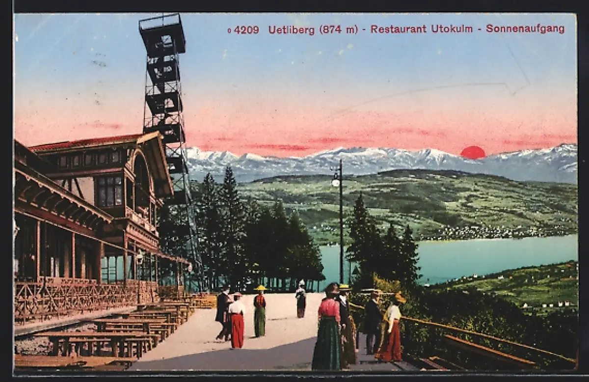 AK Uetliberg, Panorama mit Restaurant Utokulm, Aussichtsturm, See und Alpen beim Sonnenaufgang