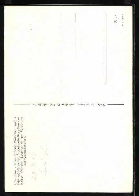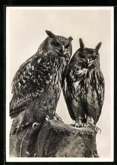 AK Uhu-Paar, links das Weibchen, rechts das Männchen, Vogelwarte Rossitten