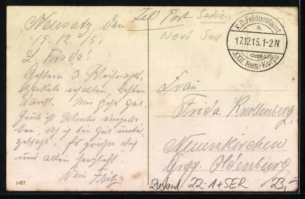 gelaufen 1915 als Feldpost, Eckknicke links, Eckknick rechts oben, guter Zustand