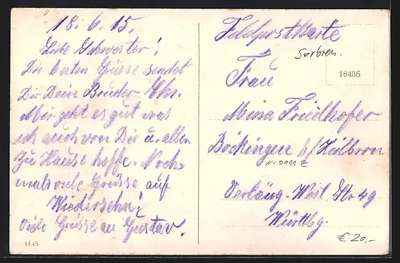 Personenbezogene Daten auf der Rückseite der Karte wurden durch blauen Textmarker unkenntlich gemacht. Die blauen Stellen sind auf die Vorderseite durchgeweicht und wirken sich negativ auf das Postkartenfoto aus