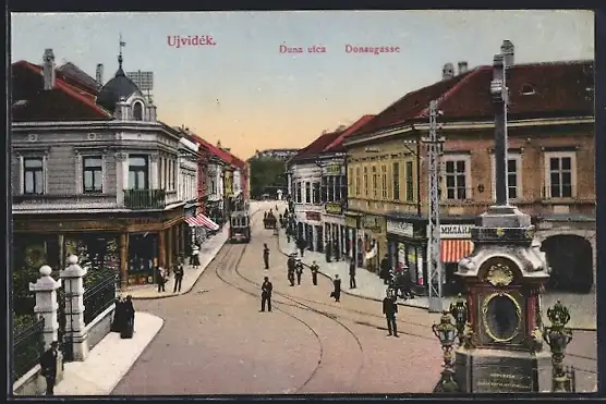 AK Ujvidek, Strassenleben in der Donaugasse, Strassenbahn