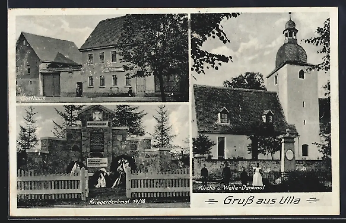 AK Ulla, Gasthaus, Kirche und Wette-Denkmal, Kriegerdenkmal