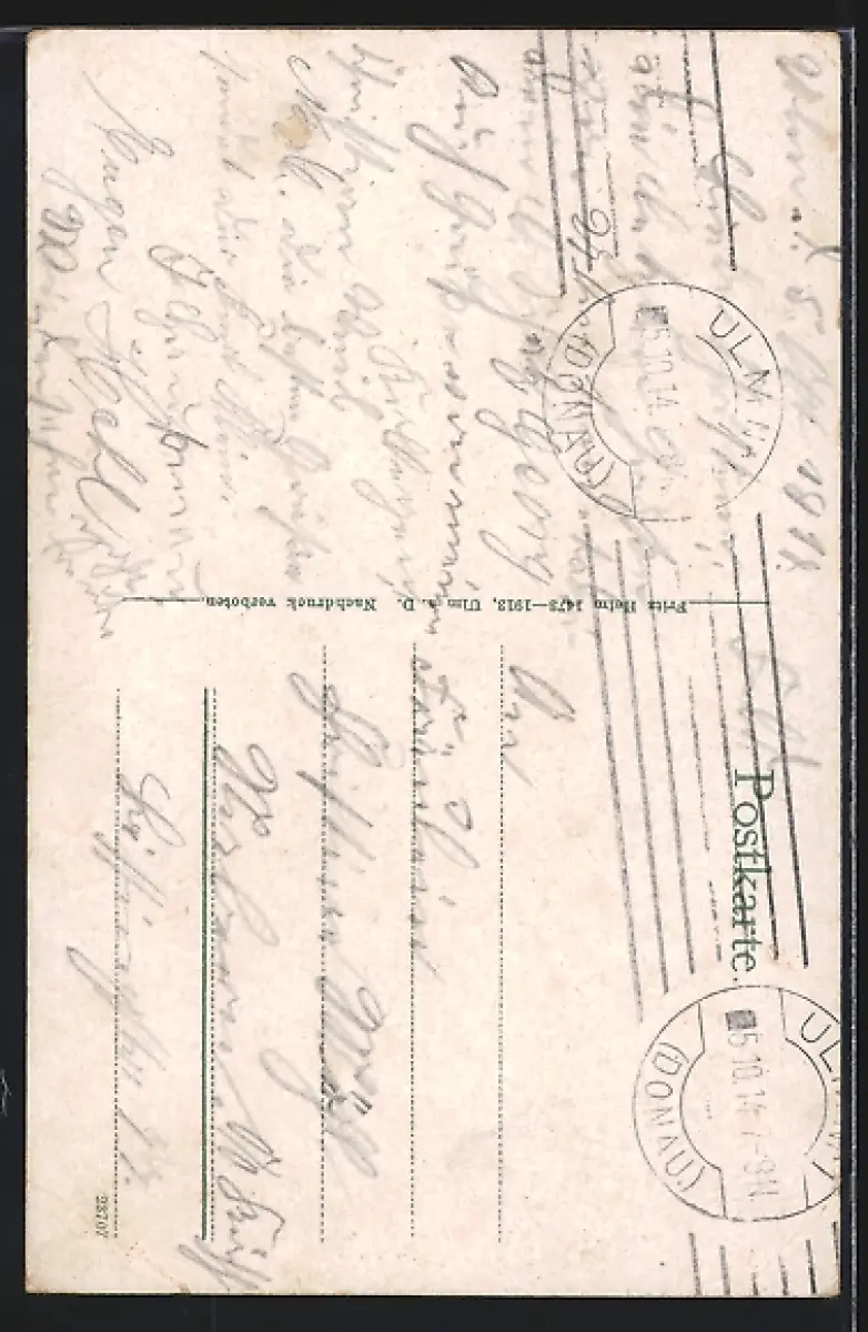 Personenbezogene Daten auf der Rückseite der Karte wurden durch blauen Textmarker unkenntlich gemacht. Die blauen Stellen sind auf die Vorderseite durchgeweicht und wirken sich negativ auf das Postkartenfoto aus