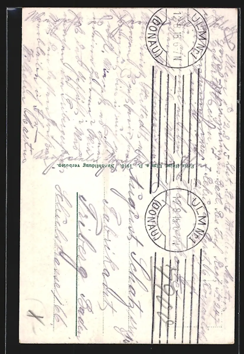 Personenbezogene Daten auf der Rückseite der Karte wurden durch blauen Textmarker unkenntlich gemacht. Die blauen Stellen sind auf die Vorderseite durchgeweicht und wirken sich negativ auf das Postkartenfoto aus