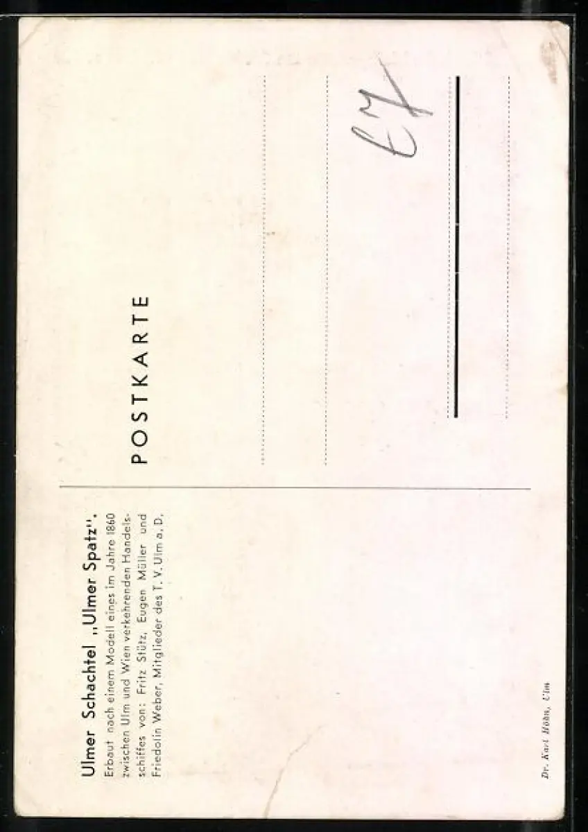AK Ulm a. D., Abfahrt mit der Ulmer Schachtel Ulmer Spatz beim Metzgerturm am 26. VI. 1932, Reiseroute 1932/33