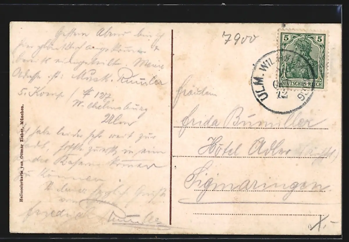 Personenbezogene Daten auf der Rückseite der Karte wurden durch blauen Textmarker unkenntlich gemacht. Die blauen Stellen sind auf die Vorderseite durchgeweicht und wirken sich negativ auf das Postkartenfoto aus