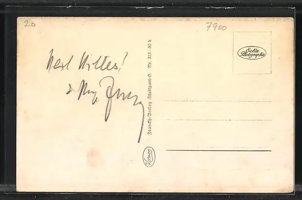Personenbezogene Daten auf der Rückseite der Karte wurden durch blauen Textmarker unkenntlich gemacht. Die blauen Stellen sind auf die Vorderseite durchgeweicht und wirken sich negativ auf das Postkartenfoto aus