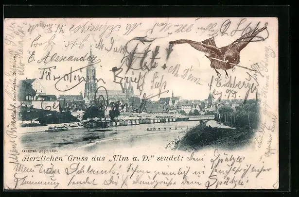 AK Ulm a. D., Uferpartie mit Kirche und Ulmer Spatz