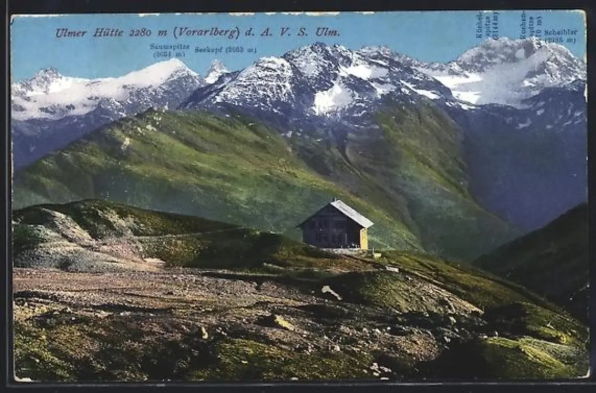 AK Ulmer Hütte, Berghütte mit Saumspitze und Seekopf
