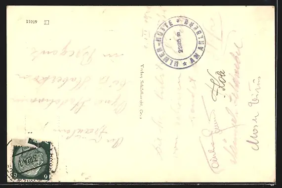 Personenbezogene Daten auf der Rückseite der Karte wurden durch blauen Textmarker unkenntlich gemacht. Die blauen Stellen sind auf die Vorderseite durchgeweicht und wirken sich negativ auf das Postkartenfoto aus