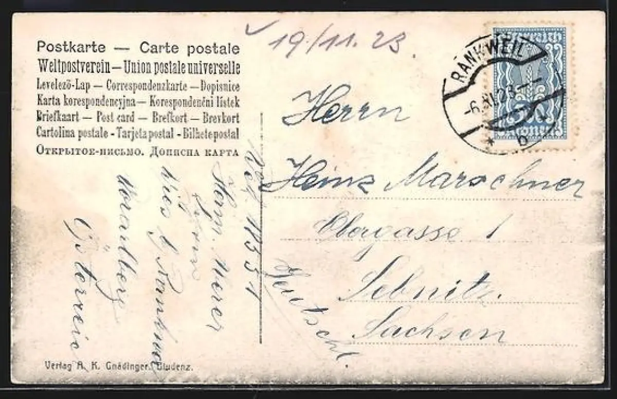 alte Ansichtskarte, gelaufen 1923, Eckknick unten li., guter Zustand