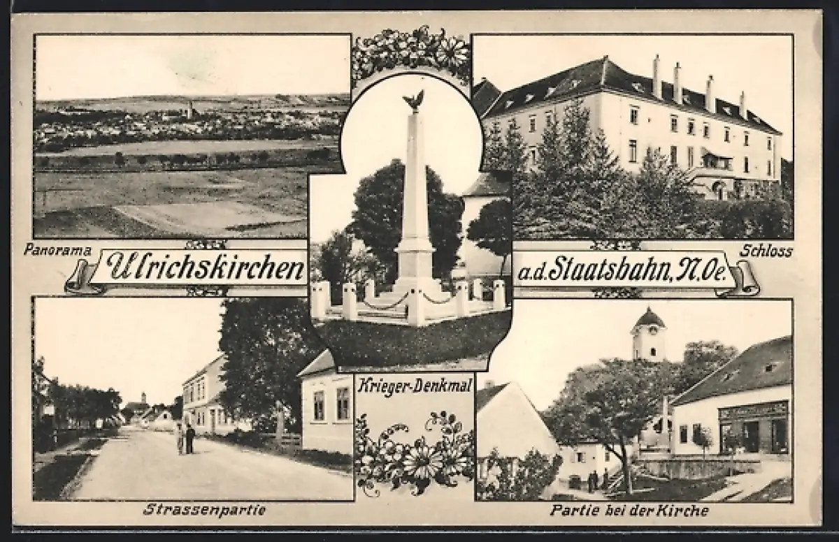 AK Ulrichskirchen a. d. Staatsbahn, Schloss, Krieger-Denkmal, Partie bei der Kirche