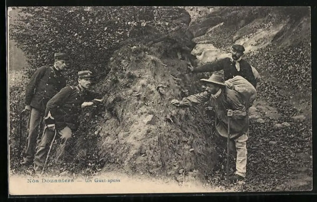 AK Un Guet-Apens avec Douanniers, Französische Zollbeamte mit Wanderern