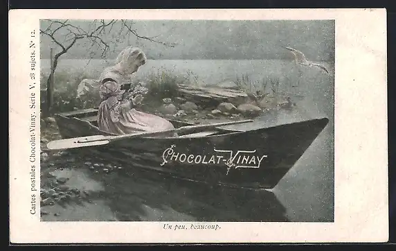 AK Un peu, beaucoup, Junge Dame mit Blumen in einem Kahn, Reklame Chocolat-Vinay