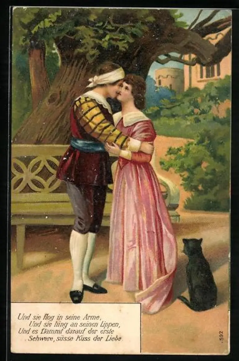 AK Und sie flog in seine Arme..., Paar mit Katze küsst sich