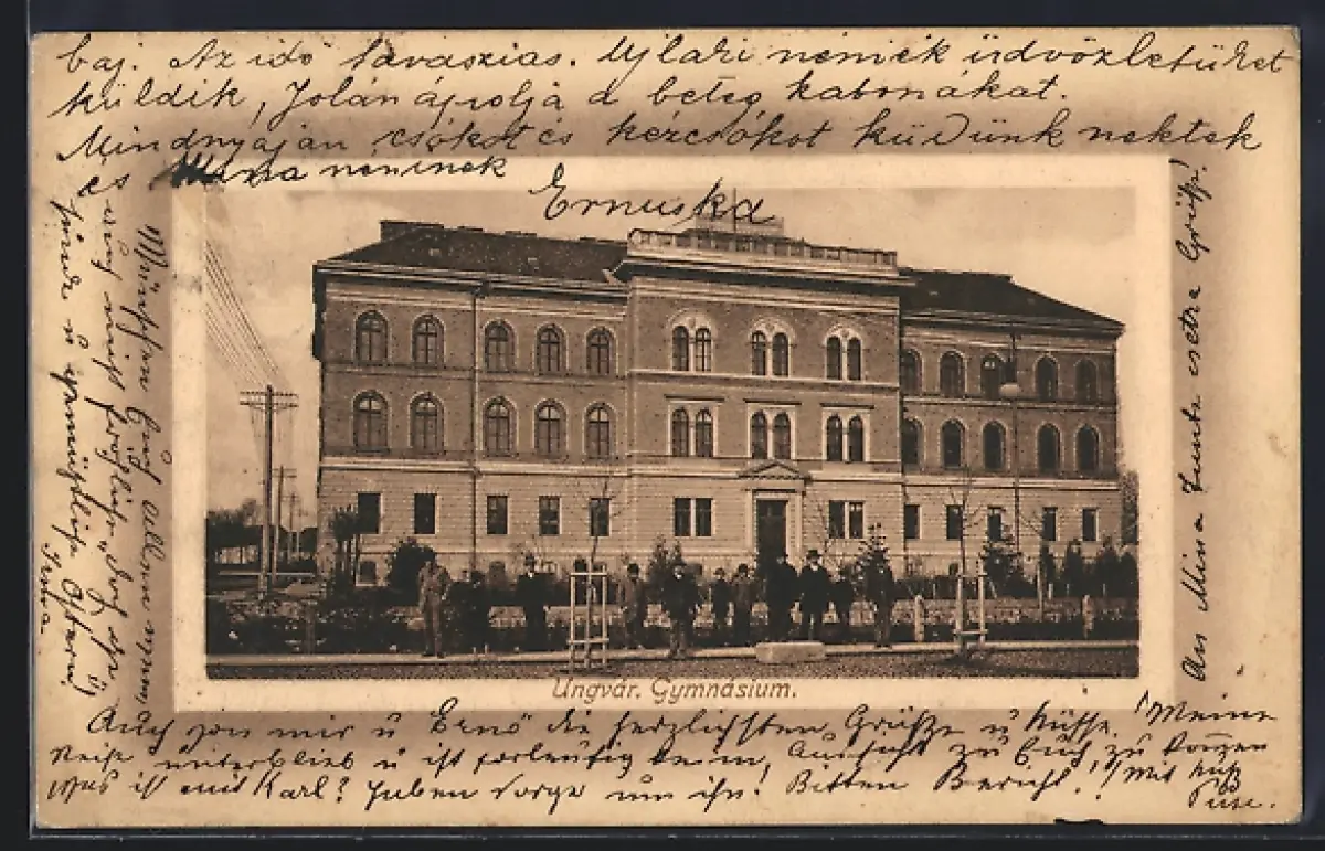 AK Ungvar, Gymnasium, Frontansicht mit kleiner Versammlung