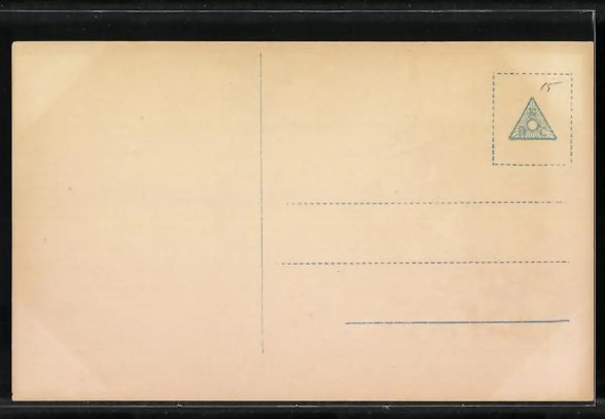 Personenbezogene Daten auf der Rückseite der Karte wurden durch blauen Textmarker unkenntlich gemacht. Die blauen Stellen sind auf die Vorderseite durchgeweicht und wirken sich negativ auf das Postkartenfoto aus