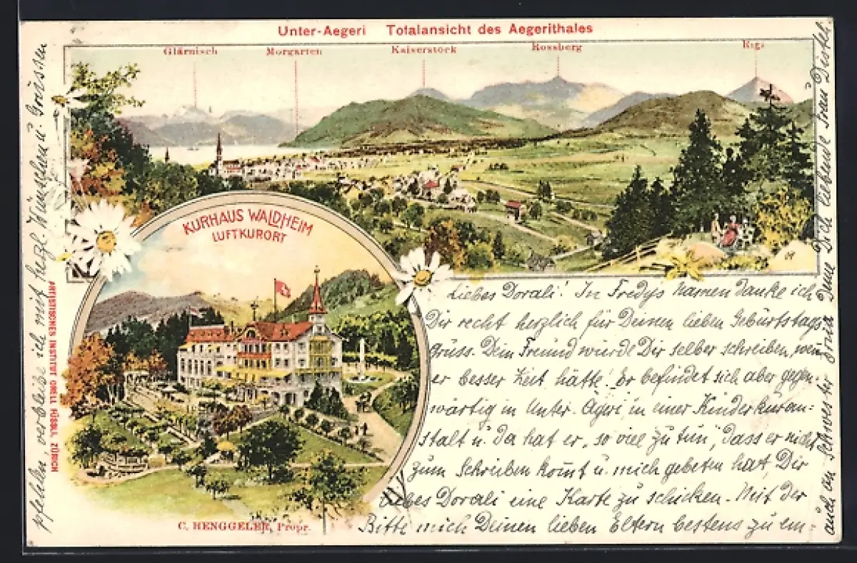 AK Unter-Aegeri, Kurhaus Waldheim mit Umgebung, Bes. C. Henggeler, Totalansicht des Aegerithales