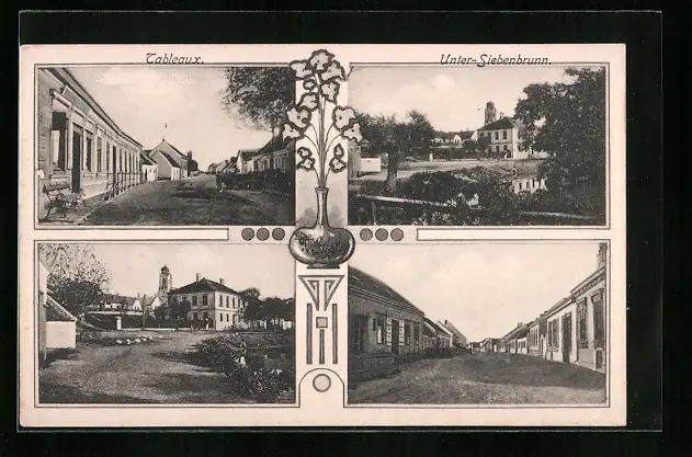 AK Unter-Siebenbrunn, Strassenpartie mit Geschäft, Ortspartie mit Kirche, Strassenpartie mit Gebäudeansicht
