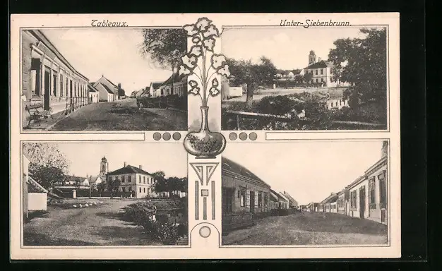 AK Unter-Siebenbrunn, Strassenpartie mit Geschäft, Ortspartie mit Kirche, Strassenpartie mit Gebäudeansicht