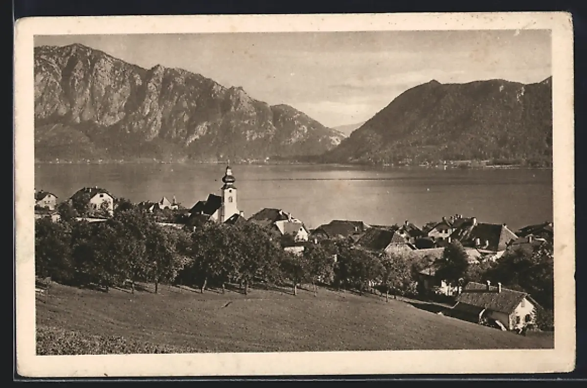AK Unterach am Attersee, Ortsansicht mit See aus der Vogelschau