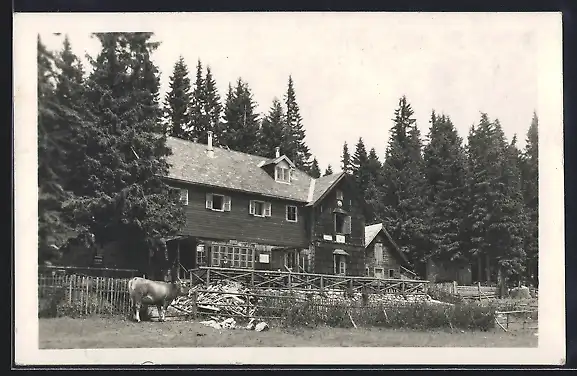 AK Unterberg-Schutzhaus, Weide mit Rind vor der Berghütte