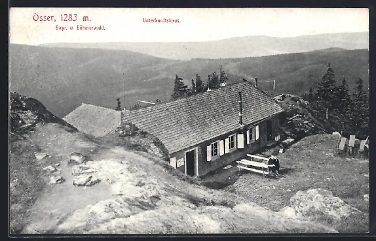 AK Unterkunftshaus Osser, Berghütte mit Besuchern aus der Vogelschau