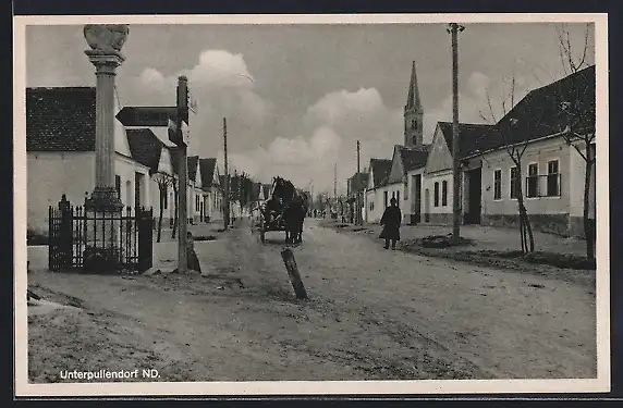AK Unterpullendorf, Ortspartie mit Säule und Pferdefuhrwerk