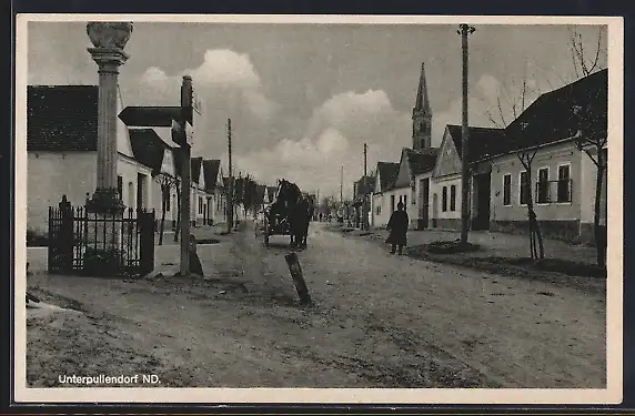AK Unterpullendorf, Partie an der Abzweigung mit Säule, Pferdefuhrwerk und Passant