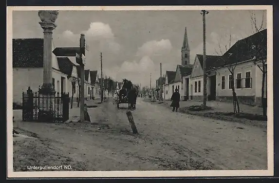 AK Unterpullendorf, Partie an der Abzweigung mit Säule, Pferdefuhrwerk und Passant