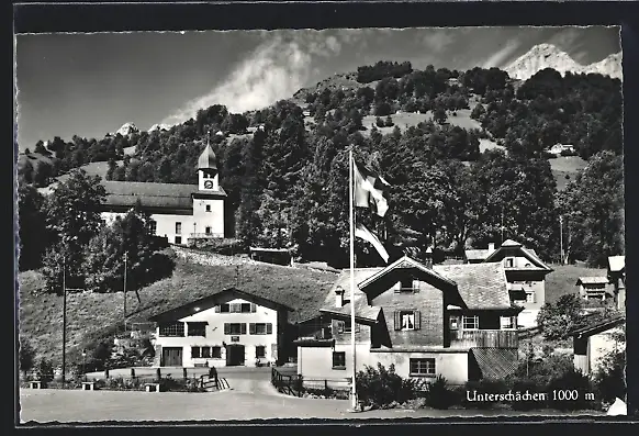 AK Unterschächen, Ortsansicht mit wehender Schweizer Flagge in den Bergen