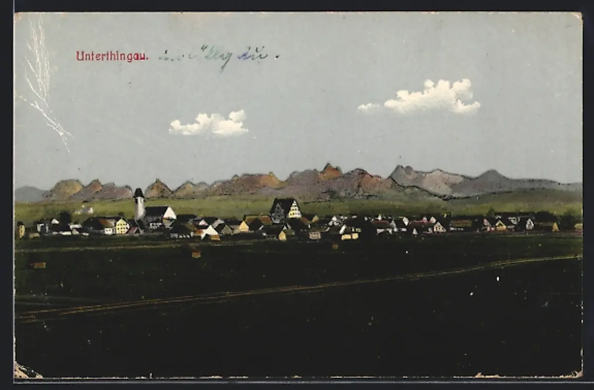 AK Unterthingau, Ortsansicht mit Kirche und Alpenpanorama