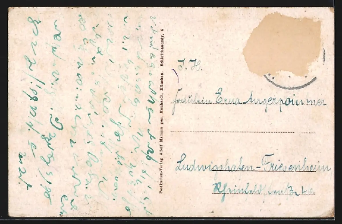 Personenbezogene Daten auf der Rückseite der Karte wurden durch blauen Textmarker unkenntlich gemacht. Die blauen Stellen sind auf die Vorderseite durchgeweicht und wirken sich negativ auf das Postkartenfoto aus