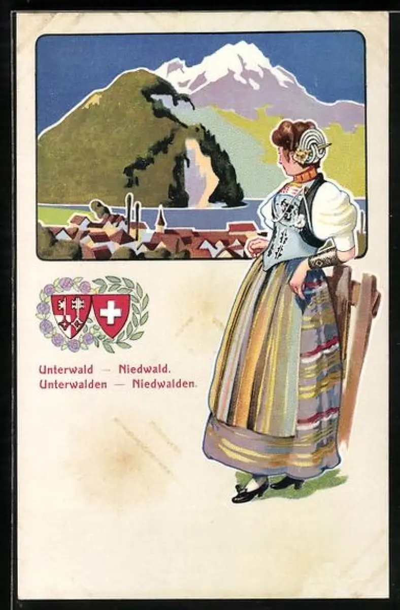 AK Unterwald, Schweizerin in Tracht, Wappen