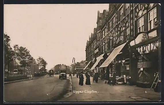 AK Upper Clapton, Strassenpartie mit Geschäften und Passanten