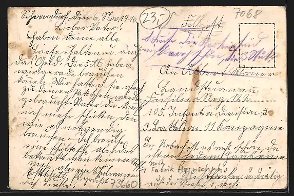 Personenbezogene Daten auf der Rückseite der Karte wurden durch blauen Textmarker unkenntlich gemacht. Die blauen Stellen sind auf die Vorderseite durchgeweicht und wirken sich negativ auf das Postkartenfoto aus