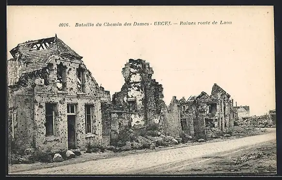 AK Urcel, Bataille du Chemin des Dames, Ruines route de Laon