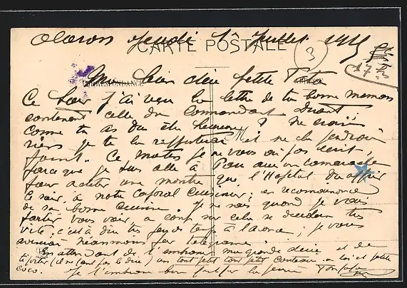 Personenbezogene Daten auf der Rückseite der Karte wurden durch blauen Textmarker unkenntlich gemacht. Die blauen Stellen sind auf die Vorderseite durchgeweicht und wirken sich negativ auf das Postkartenfoto aus