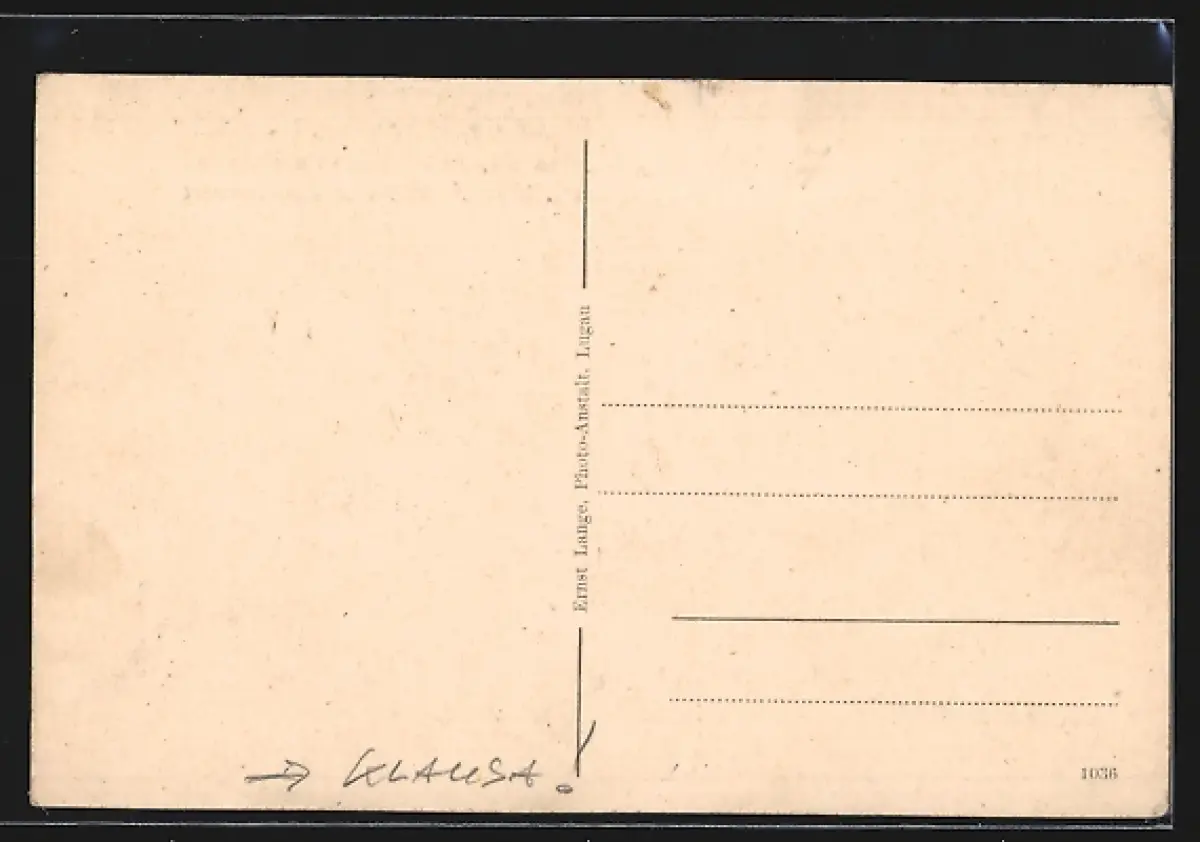 Personenbezogene Daten auf der Rückseite der Karte wurden durch blauen Textmarker unkenntlich gemacht. Die blauen Stellen sind auf die Vorderseite durchgeweicht und wirken sich negativ auf das Postkartenfoto aus