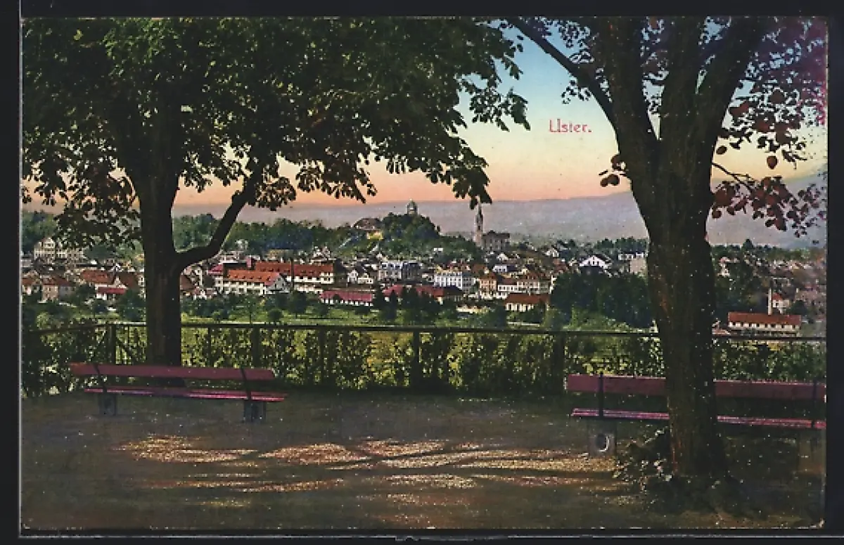 AK Uster, Blick auf den Ort mit Bänken und Bäumen im Vordergrund