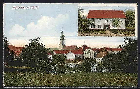 AK Utzeneich, Gutshof, Ortsansicht von der Wiese aus