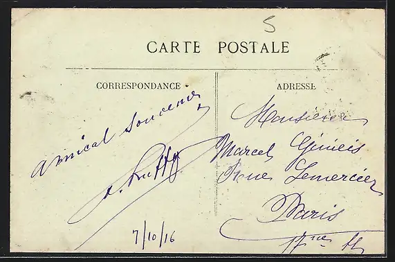 Personenbezogene Daten auf der Rückseite der Karte wurden durch blauen Textmarker unkenntlich gemacht. Die blauen Stellen sind auf die Vorderseite durchgeweicht und wirken sich negativ auf das Postkartenfoto aus